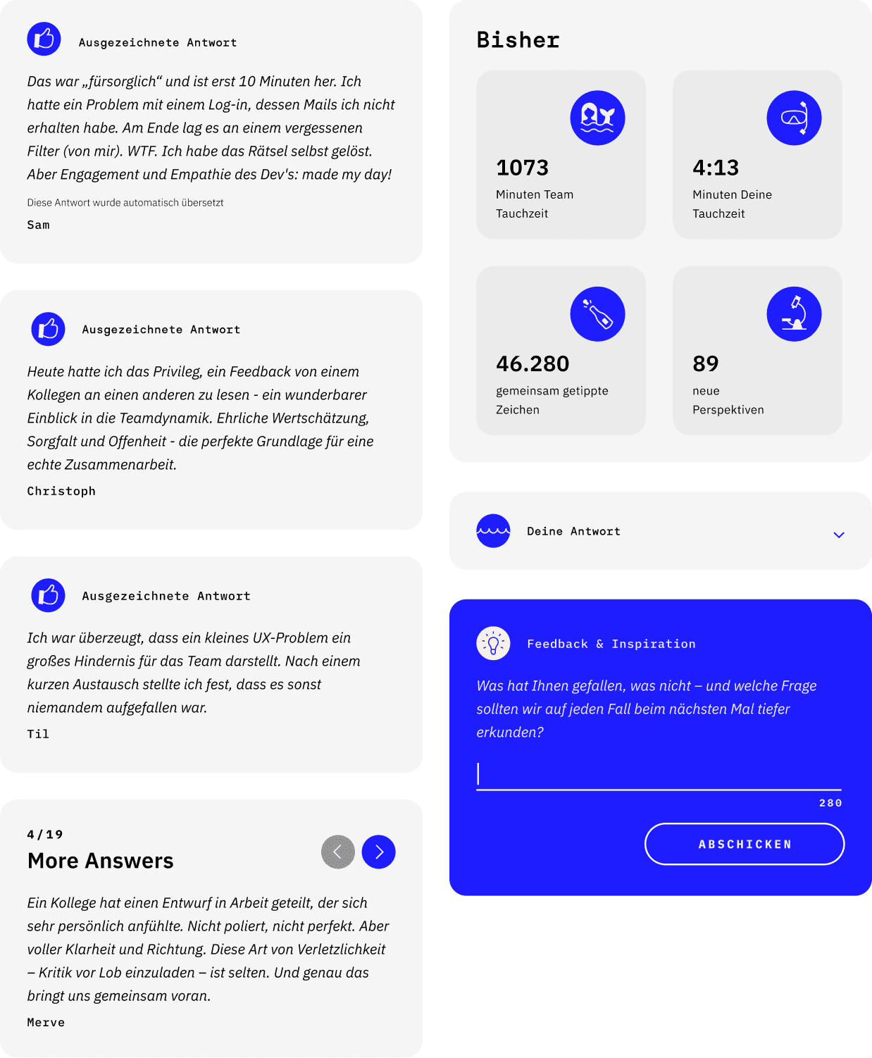 Dive macht Werte, Kultur und Purpose für das Team greifbar – durch ihre eigenen Anekdoten, Perspektiven und Ideen. Authentisch und aus erster Hand. Tatsächlich erlebt und nicht nur erdacht.