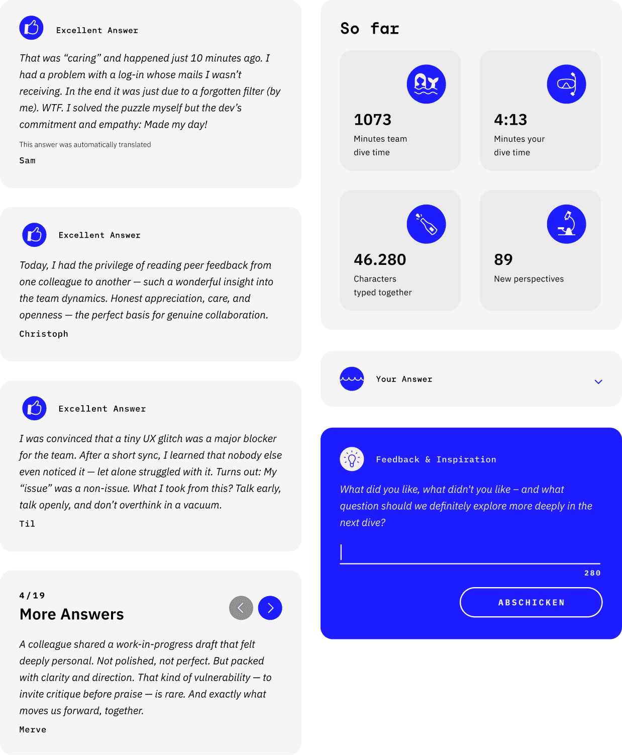 The Dive makes values, culture and purpose tangible for the team – through their own anecdotes, perspectives and ideas. Authentic and first-hand: experienced, not merely conceived.